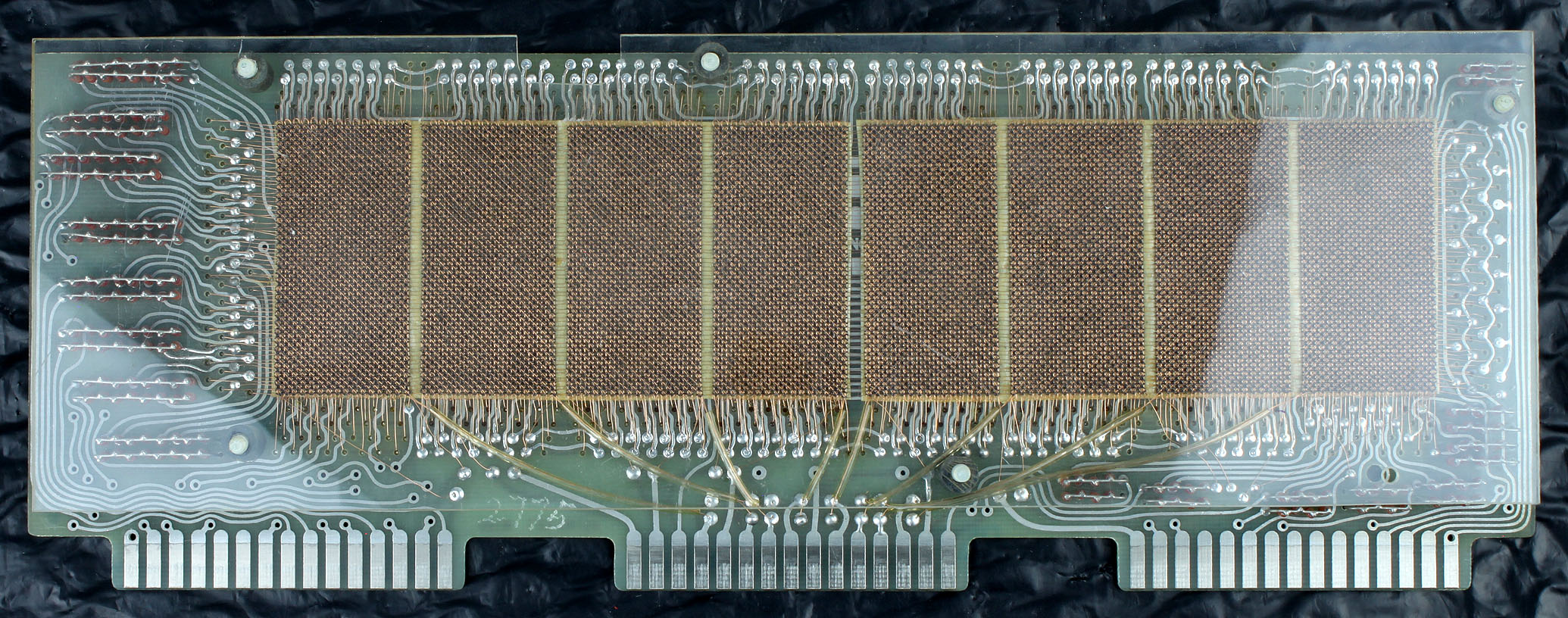 So ein Ringkernspeicher (RAM) ist in jeder Hinsicht faszinierend. Einem Gewebe gleich sind unzählige Kupferdrähte von oben nach unten und von links nach rechts miteinander verflochten. An den Kreuzungspunkten laufen sie durch Ferritringe, in denen je nach Stromfluss durch die Kupferdrähte ein Bit magnetisch gesetzt oder nicht gesetzt wird. Betrachtet man so eine Kernspeicherplatte mit der Lupe, so kann man den Ort eines jeden gespeicherten Bits sehen.