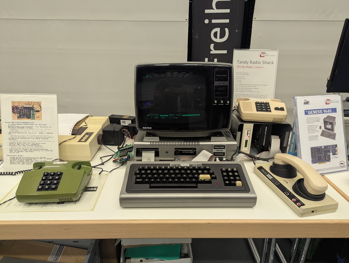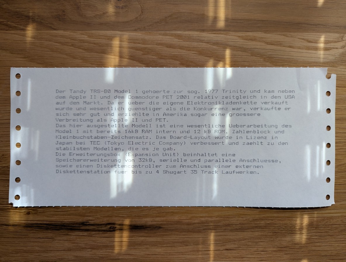 Zuallererst fiel mir ein Epson FX-80 Drucker (damals für mich etwa 2000 DM) auf. Denn genau den habe ich bei uns im Keller stehen und es interessierte mich, ob er noch funktionieren könnte. So kam ich mit Jürgen ins Gespräch. Er bestätigte dass der FX-80 ohne große Restaurierung noch immer funktioniert und druckte mir darauf einen kleinen Zettel mit einem Text über die eigentlich von ihm vorgeführten TRS-80 Modelle aus. Einige Jahre später gab es die ersten NLQ Drucker, also Drucker die eine sogenannte Near Letter Quality besaßen. Der FX-80, für mich einer der ersten Nadeldrucker für Privatanwender, druckte seine Texte mit nur 9 Nadeln und besaß damit ein zwar lesbares, aber auf keinen Fall ein Druckbild, welches mit der Druckbild einer Schreibmaschine mithalten konnte. Später gab es auch Drucker, die mit 24 Nadeln ein wesentlich schöneres Druckbild erzeugen konnten. Aber der FX-80 war seine 2000 Euro wert, denn er konnte seine Nadeln auch mit Bruchteilen von Millimetern positionieren und findige Entwickler nutzen das so aus, dass die Tintenpunkte der Nadeln durch mehrfaches Überfahren einer Zeile so nah beieinander gedruckt wurden, dass daraus ein wesentliches schöneres Druckbild erzeugt werden konnte.