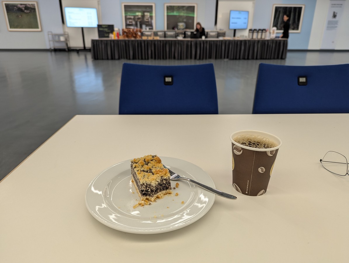 Dort gab es dann ein unangenehmes Erlebnis mit dem Kaffee und Kuchen Service im Foyer. Ich habe mir nämlich einen Kaffee und ein Stück Mohnkuchen geholt und dort hingesetzt um den Kuchen zu verspeisen. Aber der Mohnkuchen war unglaublich hart. Ich brauchte beide Hände um mir mit der Kuchengabel einen Bissen abzutrennen! Es wäre auch mit einer Hand gegangen, aber dann wäre die Gefahr groß gewesen, den abgetrennten Bissen im gleichen Moment derart zu beschleunigen, das er meterweit geflogen und jemanden erschlagen hätte. Ich habe mich dann durchgekämpft und den Mohnkuchen mit Kaffee herunter gespült. Ich bewundere den Mut eines Teilnehmers, der später sein Stück Kuchen zurück gebracht und auch mit den Händen geprüft hat, ob alle anderen Stücke und Kuchen von ähnlicher Beschaffenheit sind und die Kaffeedamen damit konfrontiert hat!