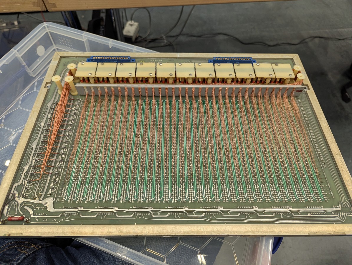 Fast noch faszinierender ist der Aufbau des Speichers der Anwendungssoftware (ROM). Es bestand aus 43 Ferrit-Ringkernen (je einer pro Bitposition eines Mikrocode-Worts). Für jedes Mikrocode-Wort lief ein extrem dünner Kupferdraht – die „Adressleitung“ – an dieser 43-Kern-Leiste entlang. Wo der Draht einen Kern durchfädelte/umwickelte, koppelte er magnetisch ein ⇒ beim Lesen entstand auf der zugehörigen Sense-Wicklung ein Puls = Bit 1. Wo der Draht vorbeigeführt wurde (keine Umwicklung), gab es keine Kopplung ⇒ Bit 0. So wurde ein 43-Bit-Wort physisch ‚gewebt‘
