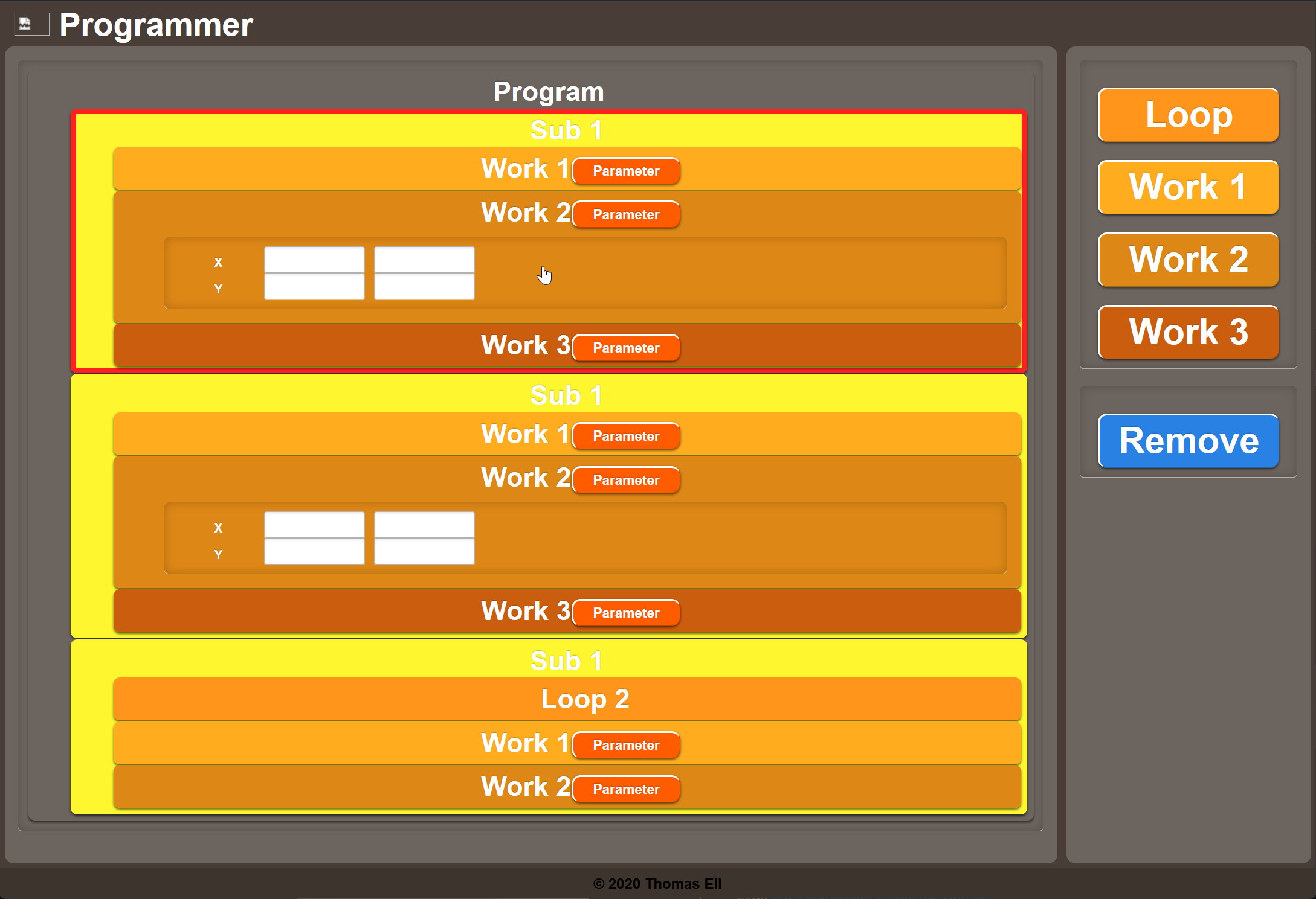 Als Fan von Baumstrukturen wollte ich so Dinge wie Programmschleifen grafisch darstellen und dachte darüber nach wie ich das mit geschachtelten Blöcken realisieren konnte. Bei meinen bisherigen Erfahrungen mit der Entwicklung von Baumeditoren war die Speicherung der Struktur immer unabhängig von der Darstellung. Beim Grübeln über den Editor traf mich plötzlich ein Geistesblitz und mir wurde schlagartig klar, das ich diesmal zur Speicherung der Struktur die Darstellung selbst nutzen konnte! Einfach die Baumstruktur in HTML durch DIVs abgebildet und zur Laufzeit über den DOM manipuliert! Schnell entwarf ich einen simplen Prototyp um meine Überlegungen zu prüfen: