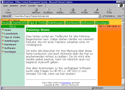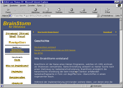 Mit dieser Schablone ist die BrainStorm-Seite im Internet generiert worden. Sie ist ein gutes Beispiel dafür, wie man mit relativ wenig Aufwand und dem Einsatz des Netscape Composers (dem bei Netscape kostenlos beiliegenden Wysiwyg-Editor) schnell eine brauchbare Schablone bauen kann. Sie kommt ohne Grafik aus und setzt alleine auf Anordnung und Farben. Gerade darum kann man sie auch sehr schnell für eigene Zwecke abändern.