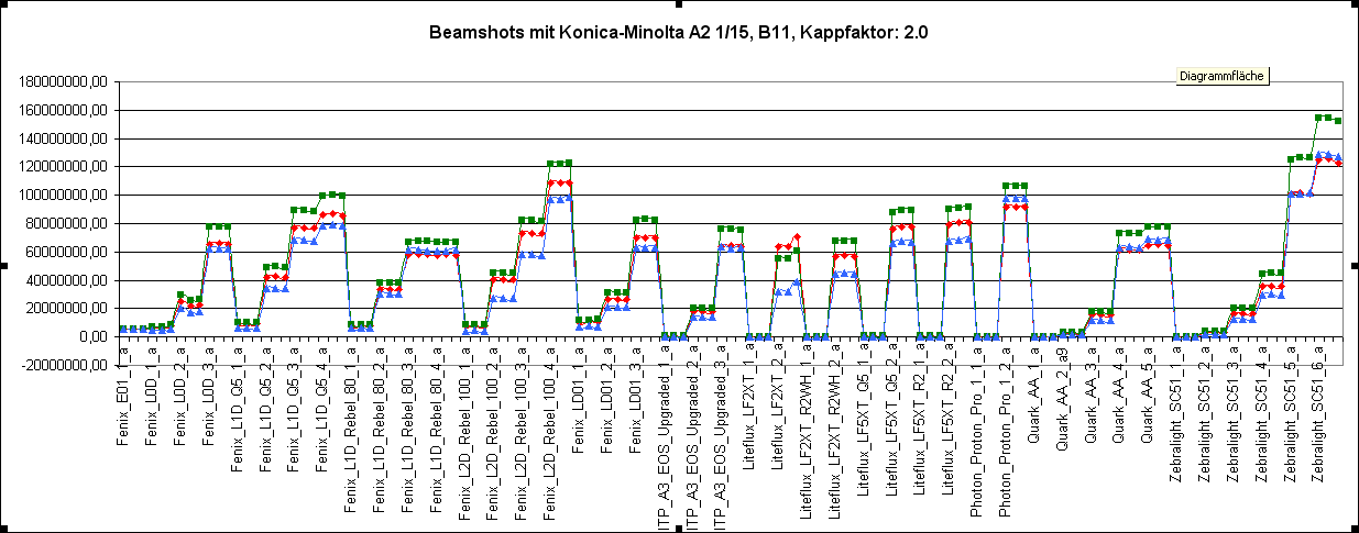 Die Werte der einzelnen Farbkanäle und die Werte der berechneten Helligkeit wurden jeweils für den kompletten Beamshot aufsummiert. Die Summen der Farbkanäle werden in einer Grafik dargestellt und die Summe der Helligkeit anhand eines Vergleichswertes (zweithellste Stufe der SC51 = 140 Lumen) in Lumen umgerechnet und in einer Tabelle zusammengeführt.