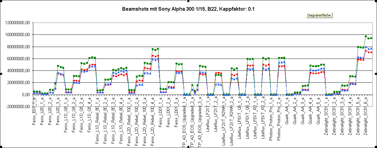 Die 14 Taschenlampen haben insgesamt 43 verschiedene Helligkeitsstufen (Level), wobei ich jeden Level, um noch mehr Sicherheit zu bekommen, insgesamt 3 Mal fotografiert habe. Macht 129 Aufnahmen. Um auch einmal zu sehen, inwieweit eine andere Kamera eine Rolle spielt, habe ich alle 129 Beamshots auch noch einmal mit einer Spiegelreflex-Kamera, einer Sony Alpha 300 wiederholt. Also insgesamt 258 Beamshots!